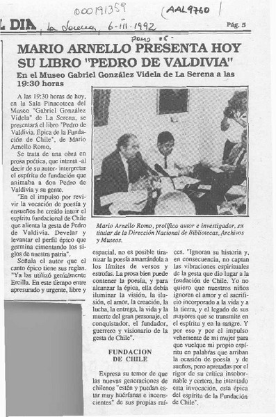 Mario Arnello presenta hoy su libro "Pedro de Valdivia" [artículo].