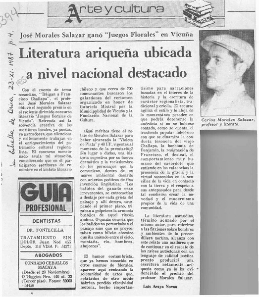 Literatura ariqueña ubicada a nivel nacional destacado [artículo] Luis Araya Novoa.