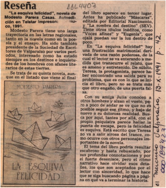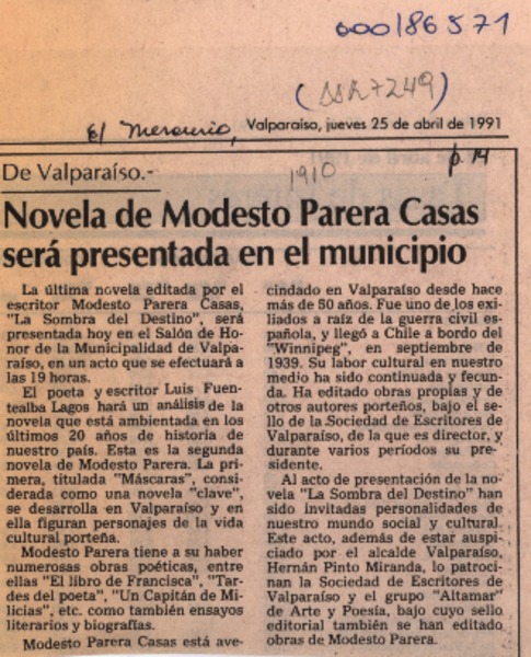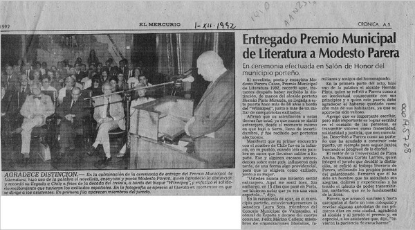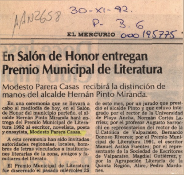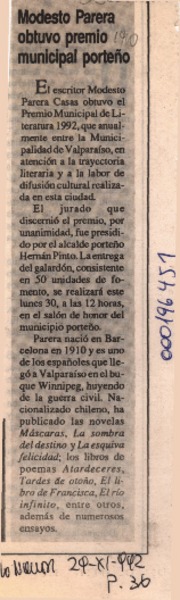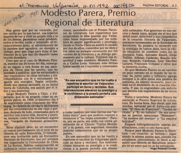 Modesto Parera Casas, Premio Municipal de Literatura Valparaíso 1992 [artículo].
