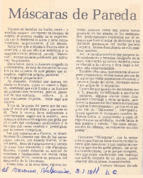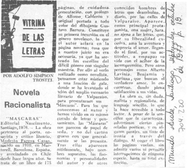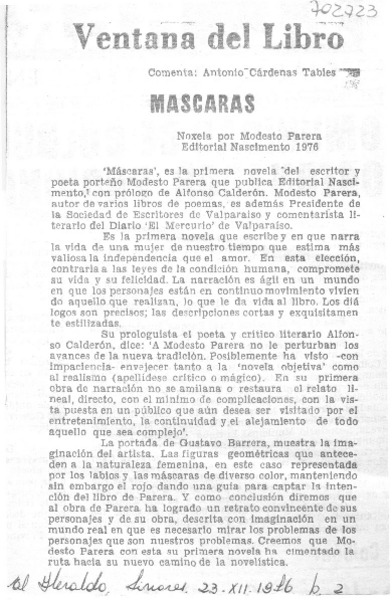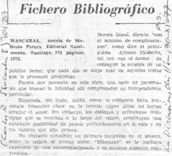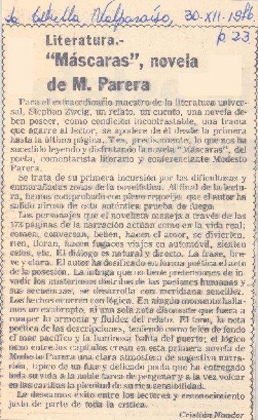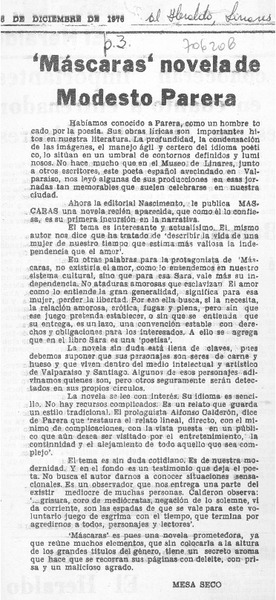 Máscaras" novela de Modesto Parera [artículo] Mesa Seco.