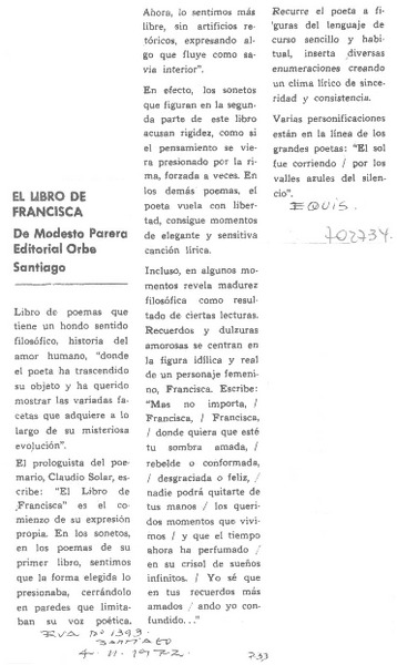 El libro de Francisca [artículo] Arturo Pérez Reinoos.