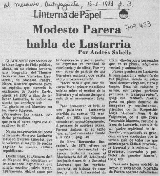 Modesto Parera habla de Lastarria [artículo] Andrés Sabella.