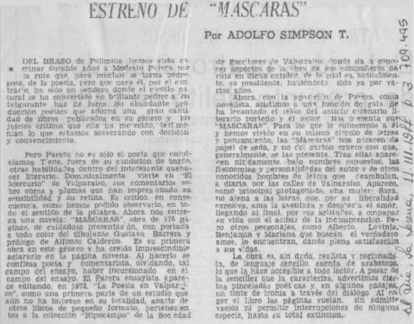 Estreno de "Máscaras" [artículo] Adolfo Simpson T.