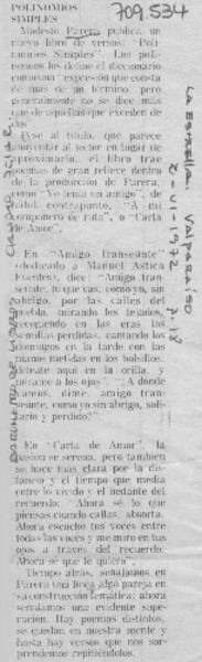 "Polinomios simples" nueva obra poética de Modesto Parera [artículo] Alfonso Larrahona Kästen.