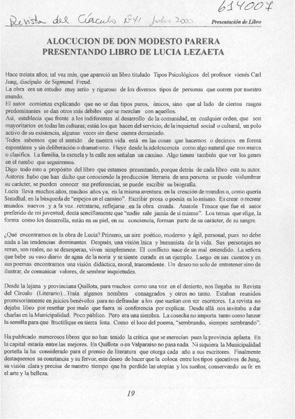 Alocución de don Modesto Parera presentando libro de Lucía Lezaeta [artículo]