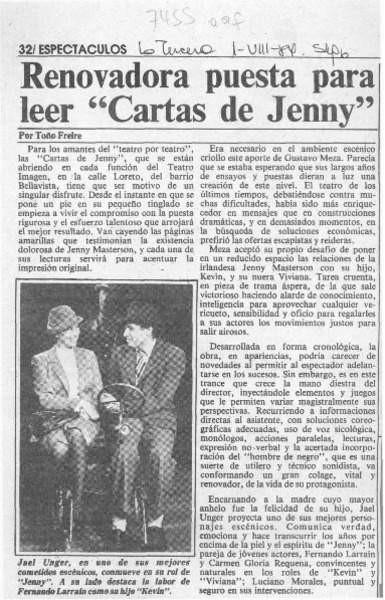 Renovadora puesta para leer "Cartas de Jenny" [artículo] Toño Freire.