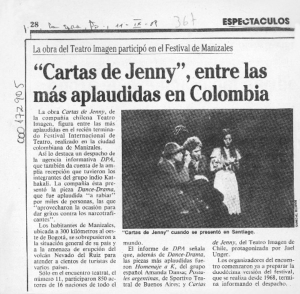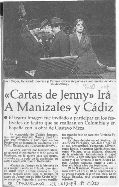 "Cartas de Jenny" irá a Manizales y Cádiz [artículo].