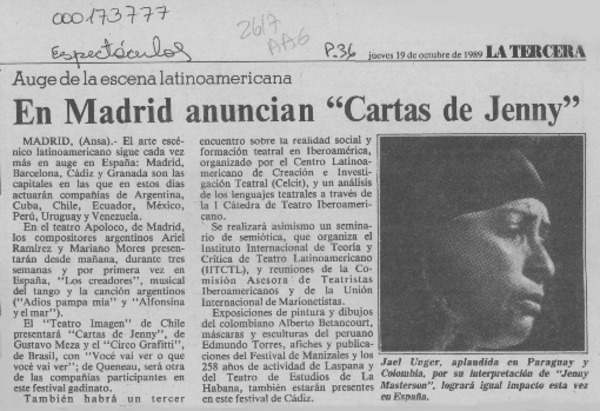 En Madrid anuncian "Cartas de Jenny" [artículo].