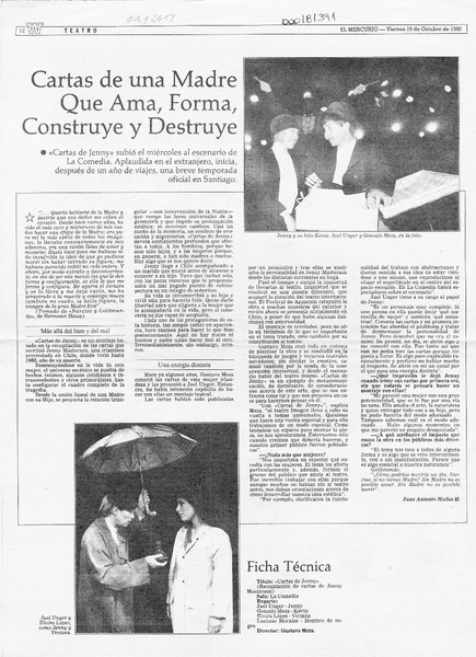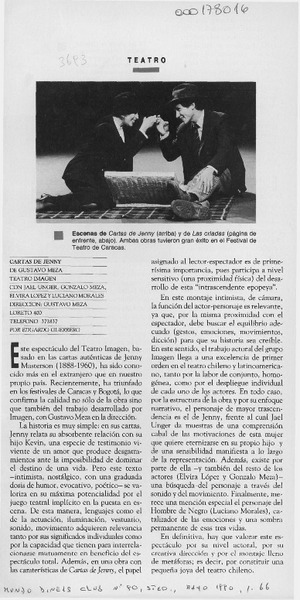 "Cartas de Jenny", obra en pos de nuevos horizontes teatrales [artículo] Yolanda Montecinos.