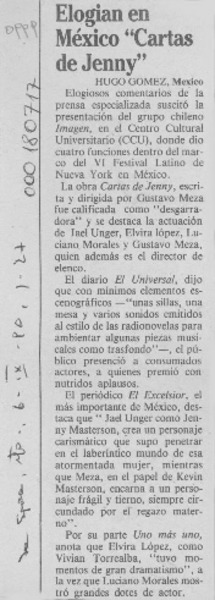 Elogian en México "Cartas de Jenny" [artículo] Hugo Gómez.
