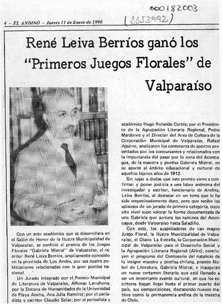René Leiva Berríos ganó los "Primeros Juegos Florales" de Valparaíso [artículo].
