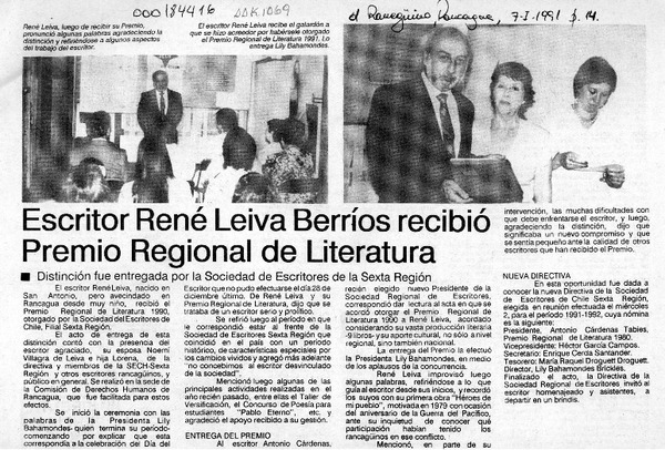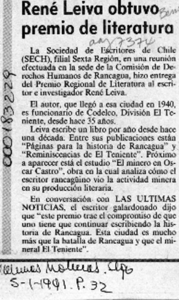 Escritor René Leiva Berríos recibió Premio Regional de Literatura [artículo].