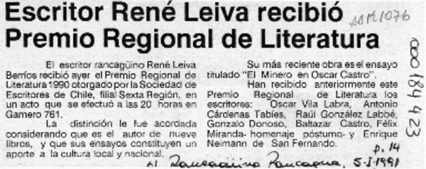 Escritor René Leiva recibió Premio Regional de Literatura [artículo].