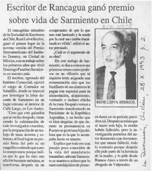 Escritor de Rancagua ganó premio sobre vida de Sarmiento en Chile [artículo].