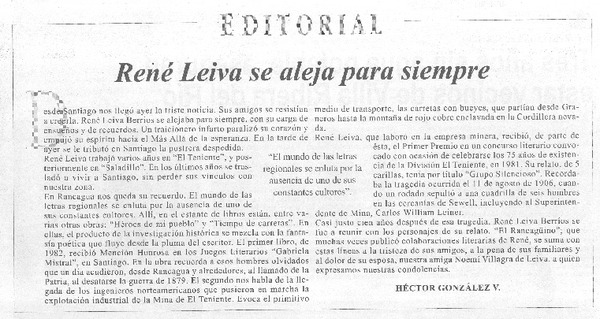 René Leiva se aleja para siempre. [artículo] Héctor González V.