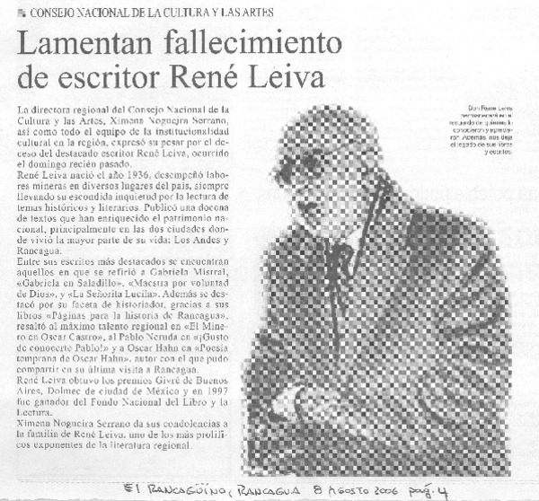 Lamentan fallecimiento de escritor René Leiva. [artículo]