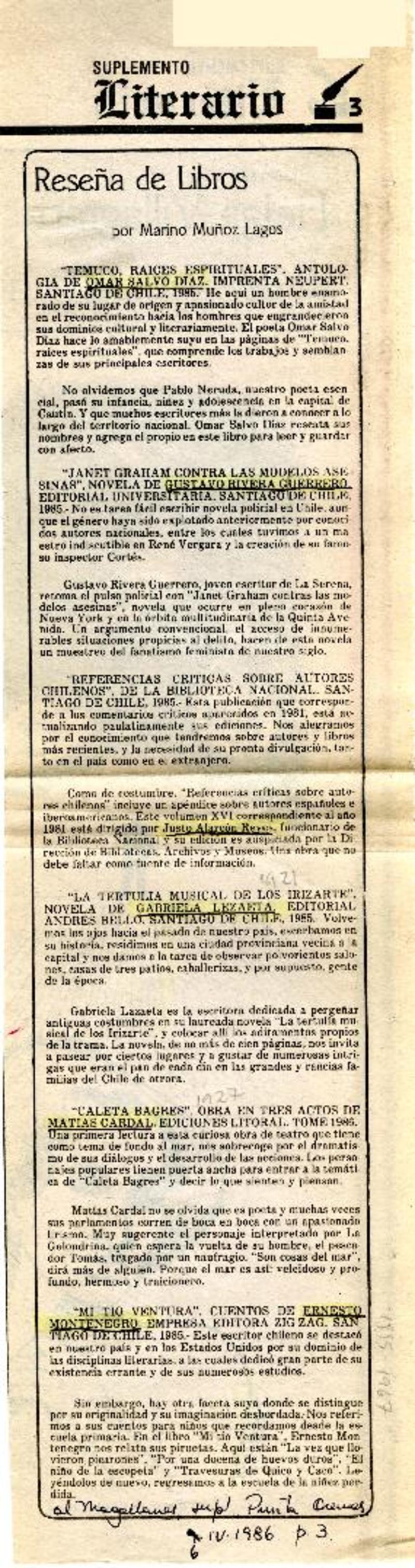 CARDAL, MATIAS - Montenegro, Ernesto - Alarcón R., Justo - SALVO DIAZ, OMAR - CALETA BAGRES - RIVERA G., GUSTAVO - JANET GRAHAM CONTRA LAS MODELOS ASESINAS - TEMUCO, RAICES ESPIRITUALES - LEZAETA, GABRIELA - TERTULIA MUSICAL DE LOS IRIZARTE, LA - Mi tío Ventura - Referencias críticas sobre autores chilenos - Camilo Lorca, Juan