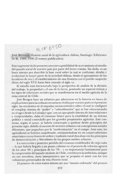 José Bengoa, Historia social de la agricultura chilena [artículo] Jaime Valenzuela Márquez.