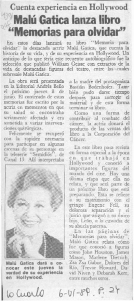 Malú Gatica lanza libro "Memorias para olvidar" [artículo].