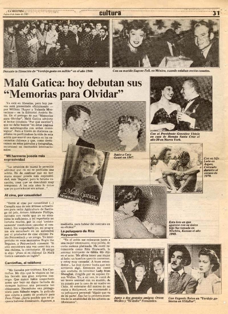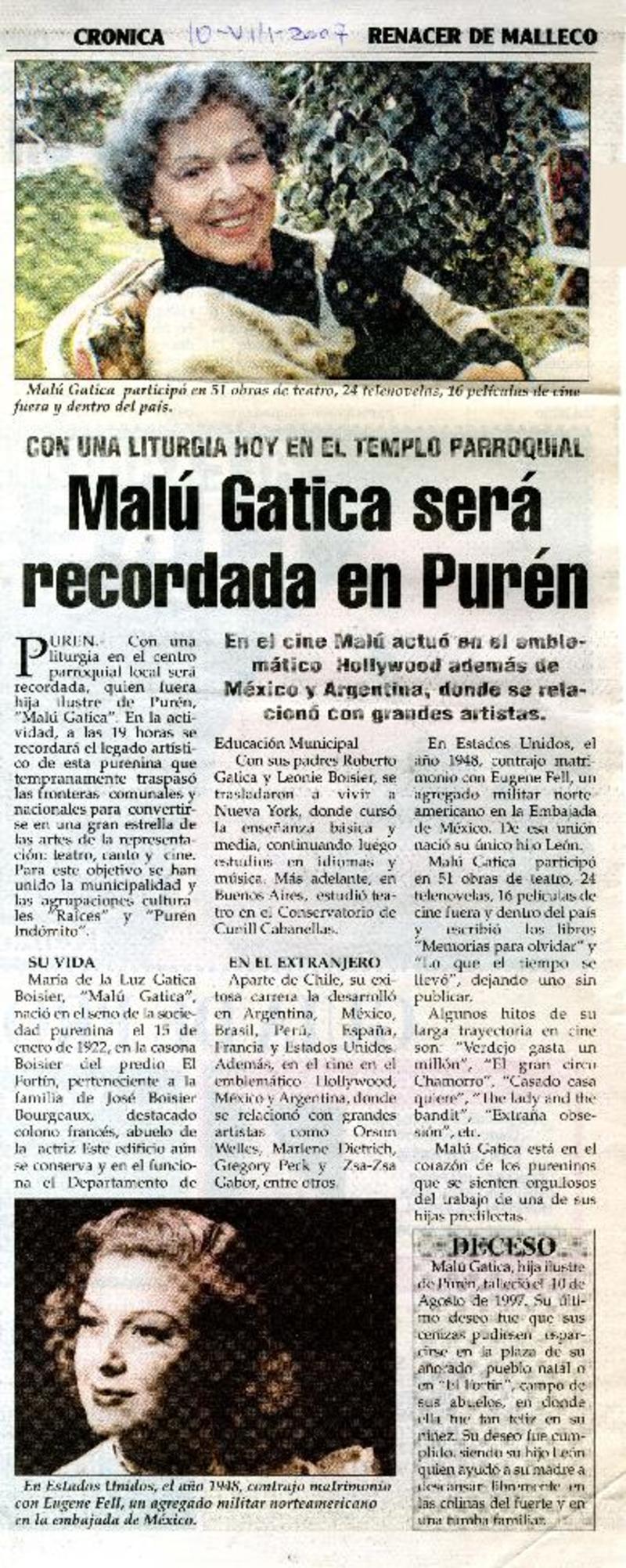 Cáncer terminó con exitosa vida de la actriz nacional Malú Gatica. [artículo]