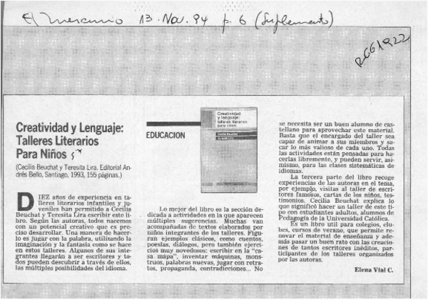 Creatividad y lenguaje, talleres literarios para niños [artículo] Elena Vial C.