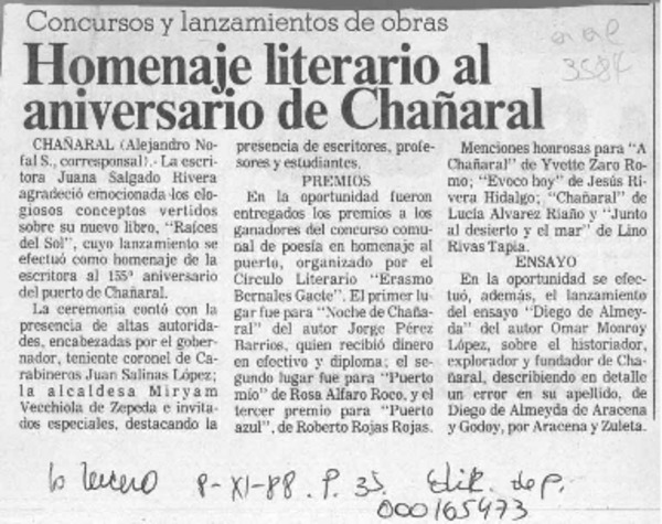 Homenaje literario al aniversario de Chañaral [artículo] Alejandro Nofal S.