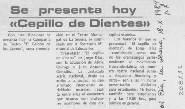 Se presenta hoy "Cepillo de dientes" [artículo].
