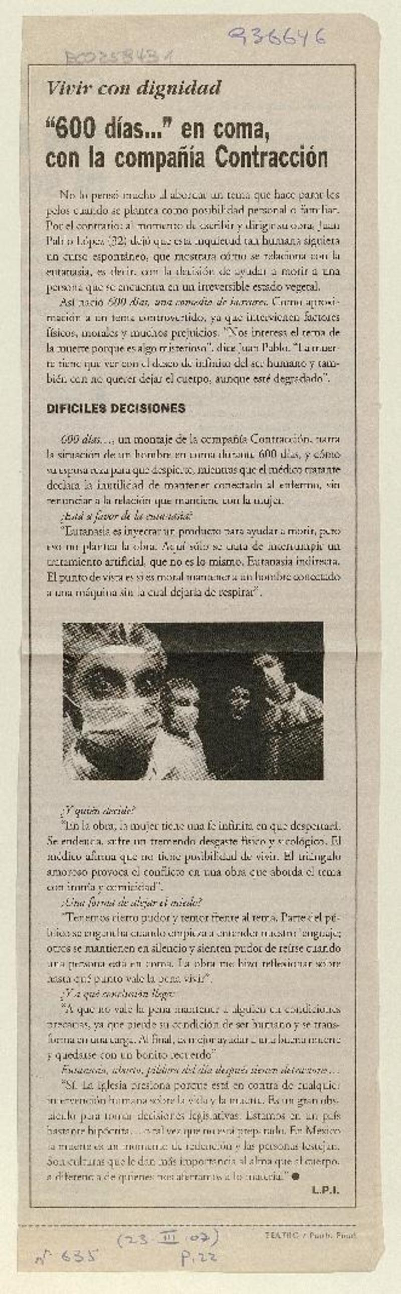 "600 días..." en coma, con la compañía Contracción [artículo] L. P. I.