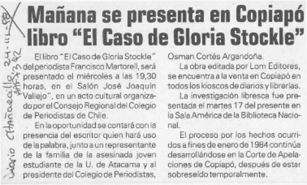 Mañana se presenta en Copiapó libro "El caso de Gloria Stockle" [artículo].