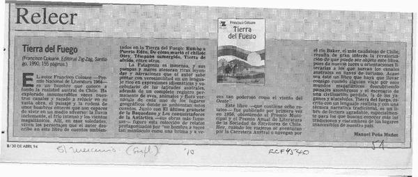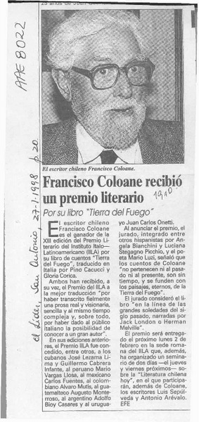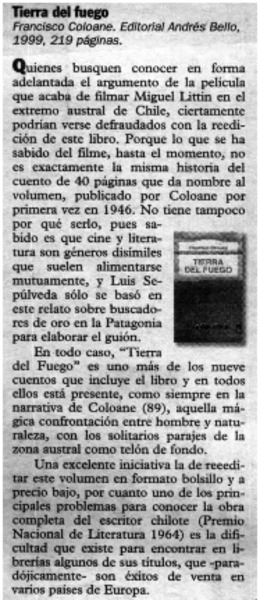 Francisco Coloane triunfa en Francia con "Tierra del fuego" [artículo] Carlos Vergara [y] Ana María Risco.
