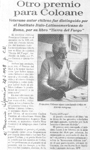 Satisfacción entre escritores magallánicos por galardón que Francisco Coloane recibió en Italia [artículo].