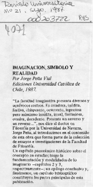 PEÑA VIAL, JORGE - IMAGINACION, SIMBOLO Y REALIDAD
