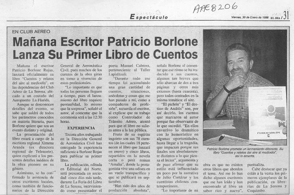 Mañana escritor Patricio Borlone lanza su primer libro de cuentos [artículo].
