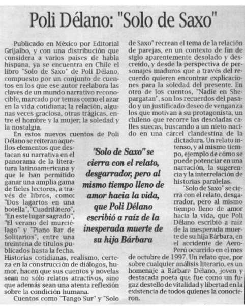 Poli Délano, "Solo de saxo" [artículo] Ramón Díaz Eterovic.