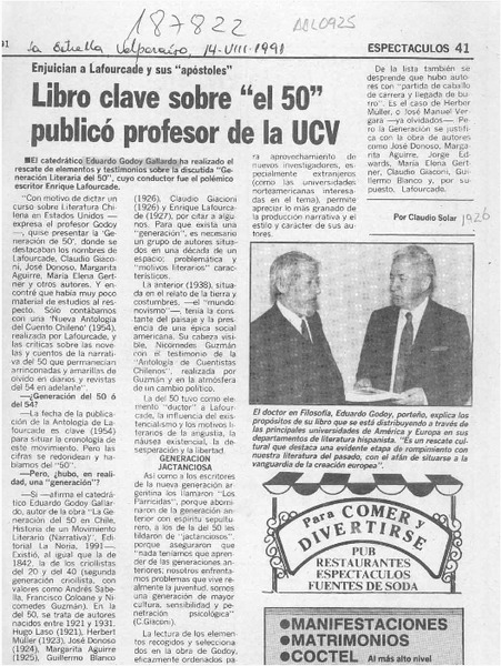 Libro clave sobre "el 50" publicó profesor de la UCV [artículo] Claudio Solar.