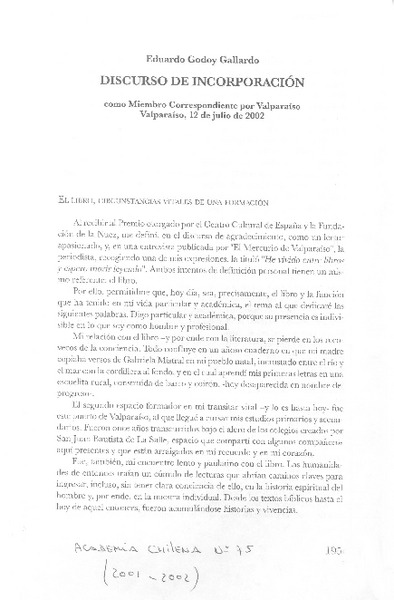 Discurso de incorporación [artículo] Eduardo Godoy Gallardo.
