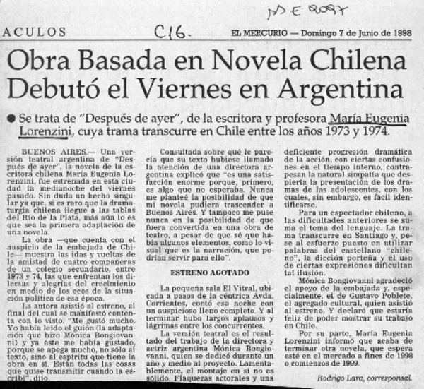 Obra basada en novela chilena debutó el viernes en Argentina [artículo] Rodrigo Lara.