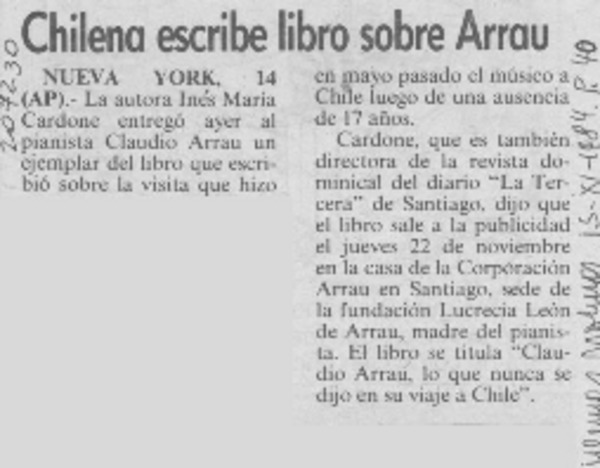 Libro sobre Arrau será lanzado en Chillán [artículo].