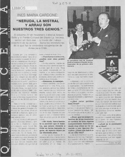 Neruda, la Mistral y Arrau son nuestros tres genios : [entrevista] [artículo] Beatriz Berger.