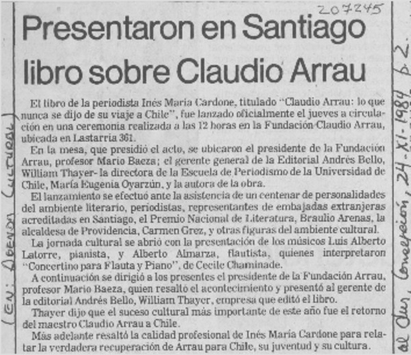 Presentaron en Santiago libro sobre Claudio Arrau [artículo].