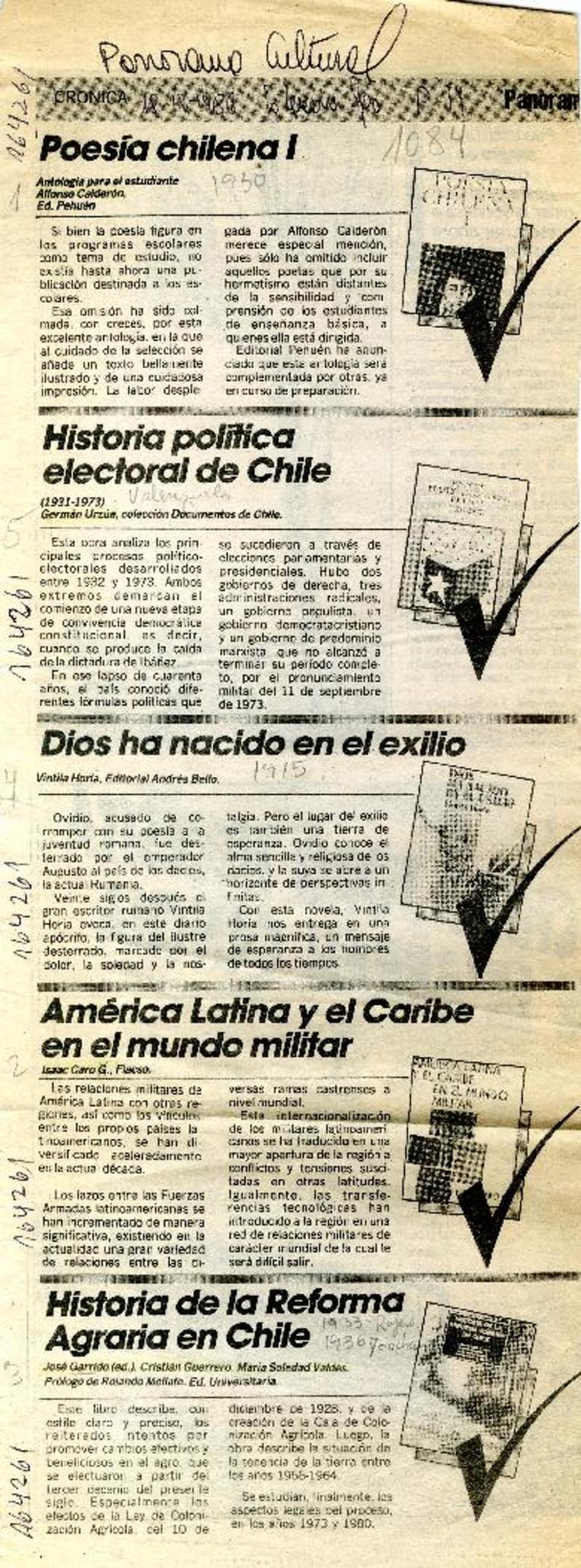Autores chilenos - Guerrero Yoacham, Cristian - Caro, Isaac - Garrido Rojas, José - Historia de la reforma agraria en Chile - Valdés, María Soledad - Calderon, Alfonso - Poesia chilena I - América Latina y el Caribe en el mundo militar - Urzua, Valenzuela, German - Historia política electoral de Chile (1931-1973)