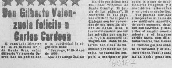 Don Gilberto Valenzuela felicita a Carlos Cardoen [artículo].