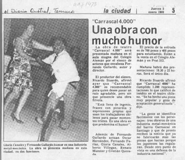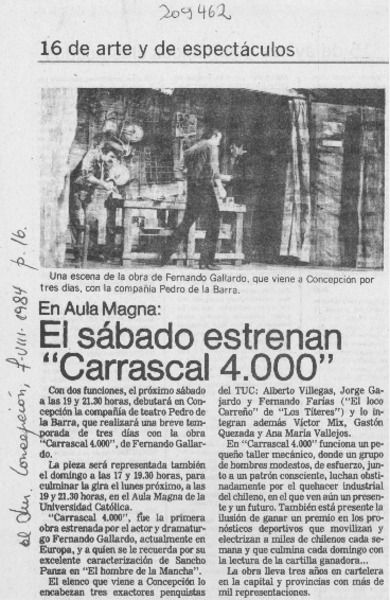 Estrenarán la obra teatral "Carrascal 4000" en Valdivia [artículo].