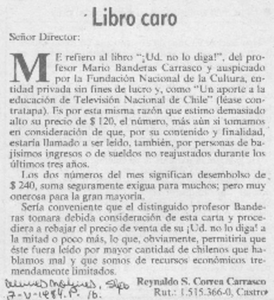 Libro caro [artículo] Reynaldo S. Correa Carrasco.