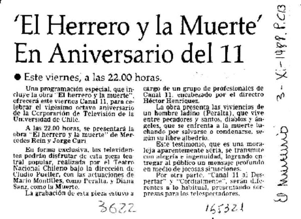 'El Herrero y la muerte' en aniversario del 11 [artículo].