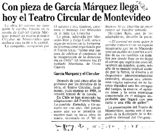 Con pieza de García Márquez llega hoy el Teatro Circular de Montevideo [artículo].