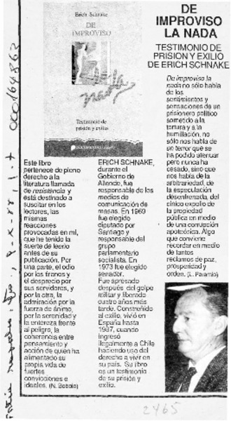 SCHNAKE, ERICH - DE IMPROVISO LA NADA