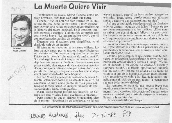La muerte quiere vivir [artículo] Antonio Rojas Gómez.