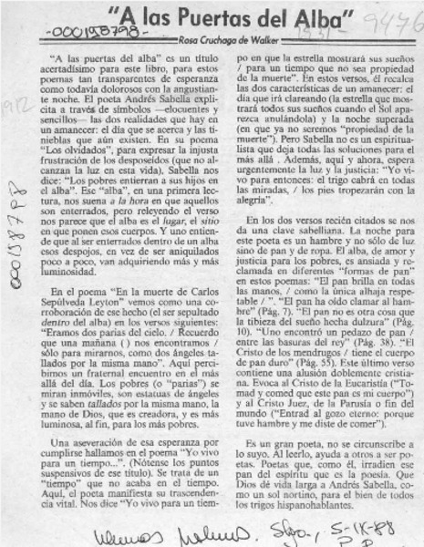 "A las puertas del alba" [artículo] Rosa Cruchaga de Walker.