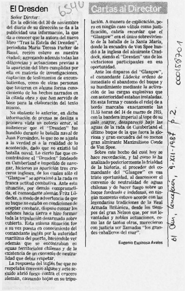 El Dresden [artículo] Eugenio Espinosa Avalos.